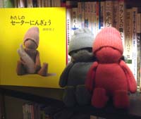 田中周子さんのセーター人形HIRONを本棚にちょこんと座らせておいたら、
